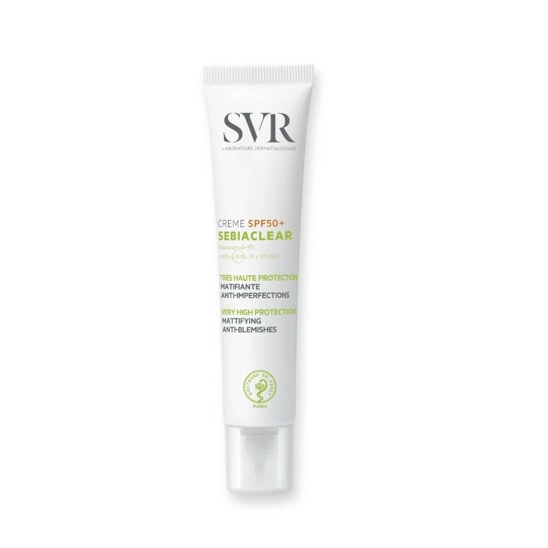 Sebiaclear Crème SPF50 protège les peaux mixtes à grasses. Il limite la production de sébum, prévient l’épaississement de la peau pour éviter l’effet rebond et les marques brunes ou rouges liées aux UV.